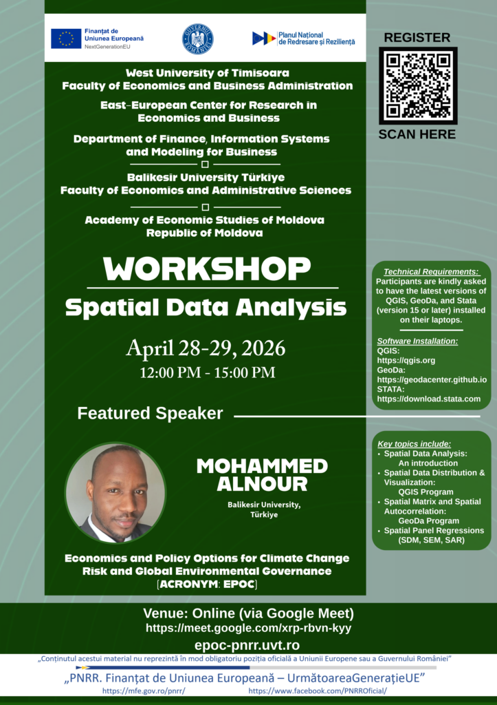 This workshop explores Spatial Data Analysis, providing participants with insights into basic spatial econometrics through theoretical background, empirical examination, and case studies. Participants will learn how to extract and work with spatial shapefiles, data visualization, distribution, and estimation of several spatial panel regressions. The session encourages interaction, exchange of ideas, and collaborative exploration of the economics of geography, with an emphasis on socioeconomic and energy indicators.